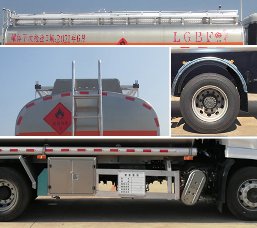 配置  1、該車(chē)適用于危險(xiǎn)品運(yùn)輸,運(yùn)送危險(xiǎn)貨物車(chē)輛類(lèi)型為:FL型,類(lèi)項(xiàng)號(hào):3。罐體有效容積:16.6立方米,運(yùn)輸介質(zhì):汽油,密度:700千克/立方米,罐體外形尺寸(長(zhǎng)×寬×高)(mm):5700×2300×1600。2、側(cè)/后防護(hù)材料為鋁合金,螺栓連接。后防護(hù)截面尺寸120×60mm,下邊緣離地高500mm。罐體上部選裝上走道,選裝弧形擋泥板,選裝右側(cè)防護(hù)樣式。3、僅采用軸距(mm):4700。后軸采用空氣懸架。隨底盤(pán)選裝駕駛室前面罩,選裝側(cè)窗玻璃;駕駛室頂部中間三個(gè)裝飾燈為選裝件;前霧燈為選裝件;駕駛室前臉擾流罩為選裝件。僅選用排氣管前置、限速裝置(限速80km/h)、前輪盤(pán)式制動(dòng)及子午線輪胎的底盤(pán);安裝帶有衛(wèi)星定位功能的行駛記錄儀;ABS型號(hào)/生產(chǎn)廠家:3631010-C2000/東科克諾爾商用車(chē)制動(dòng)系統(tǒng)(十堰)有限公司。采用的發(fā)動(dòng)機(jī)與油耗值(L/100Km)對(duì)應(yīng)關(guān)系為: B6.2NS6B210/26.5,DDi50E190-60/23.9。 該車(chē)后軸為采用空氣懸架.轉(zhuǎn)向輪安裝輪胎爆胎應(yīng)急防護(hù)裝置。該車(chē)型可選裝ETC車(chē)載裝置.