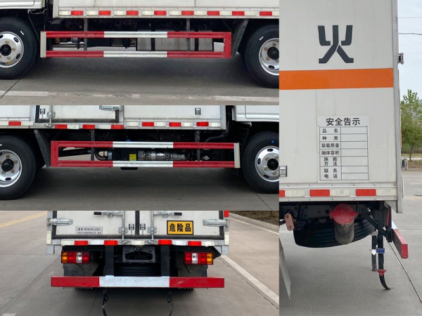 1、該車為危險品運輸車.運輸具有獨立容器(瓶)包裝的易燃液體物品.運送危險物品類項號:3類.廂體頂部封閉不可開啟.2、側(cè),后防護(hù)材料均為Q235,側(cè)防護(hù)螺栓連接,后防護(hù)焊接,截面尺寸(mm):100×50,下邊緣離地高430mm.3、整備質(zhì)量含備胎,滅火器及隨車工具;貨廂重量為1090kg;材質(zhì)/厚度:復(fù)合板結(jié)構(gòu)廂體:底板材質(zhì)為Q235,厚度3mm,側(cè)板為外Q235+中間阻燃泡沫+內(nèi)純鋁板,厚度42mm;瓦楞板結(jié)構(gòu)廂體:底板材質(zhì)為Q235,厚度3mm,側(cè)板為Q235,厚度1.5mm.4、僅選用排氣管前置、限速裝置(限速80km/h)、前輪盤式制動及子午線輪胎的底盤,轉(zhuǎn)向輪安裝輪胎爆胎應(yīng)急防護(hù)裝置,安裝具有衛(wèi)星定位功能的行駛記錄儀.ABS系統(tǒng)控制器型號/生產(chǎn)企業(yè): APG3550500A/浙江亞太機(jī)電股份有限公司,3550B500/浙江亞太機(jī)電股份有限公司,VIE ABS-II/浙江萬安科技股份有限公司.發(fā)動機(jī)/油耗值(L/100km)對應(yīng)關(guān)系為:JX493ZLQ6D/10.75,JX4D25A6H/10.83.隨底盤選裝駕駛室,選裝白色中網(wǎng),選裝白色前保,選裝黑色前保,選裝廂體側(cè)面選裝開門型式及位置,選裝不帶側(cè)開門,選裝貨廂平面或瓦楞結(jié)構(gòu);廂體側(cè)面選裝開百葉窗,選裝后部樣式,該車可選裝直接供電式ETC車載裝置.